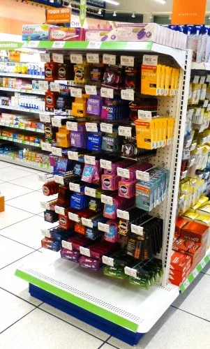 Did you ever notice how in some countries, pharmacies tuck away the condoms and other sex-related products in some corner so discreet as to be entirely invisible? So you have to suck it up and ask the clerk where they are, probably in earshot of several old ladies, mothers with children, and so forth? In Mexico City, they're pretty much in the front window, like here in Farmacia San Pablo. (The provinces are another story. One chain in Guadalajara, known as Farmacias Guadalajara, refuses to sell them at all.)